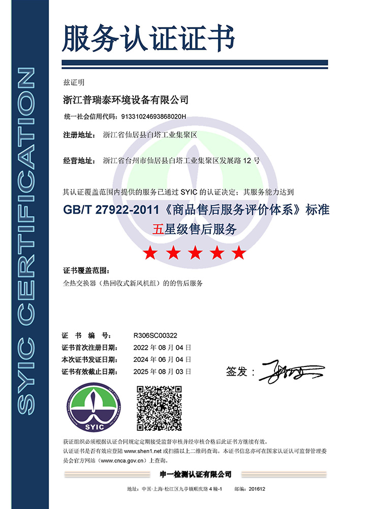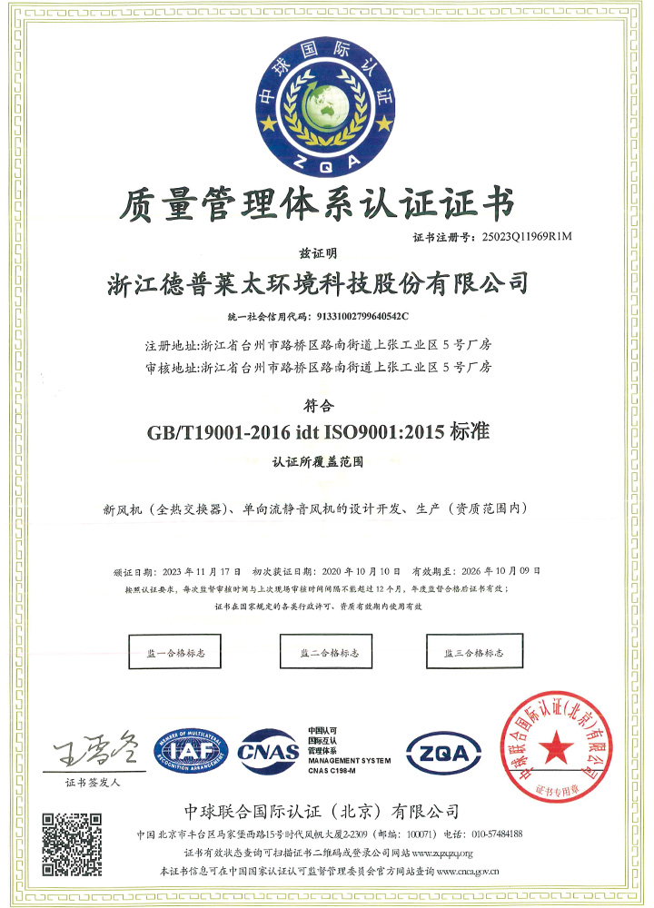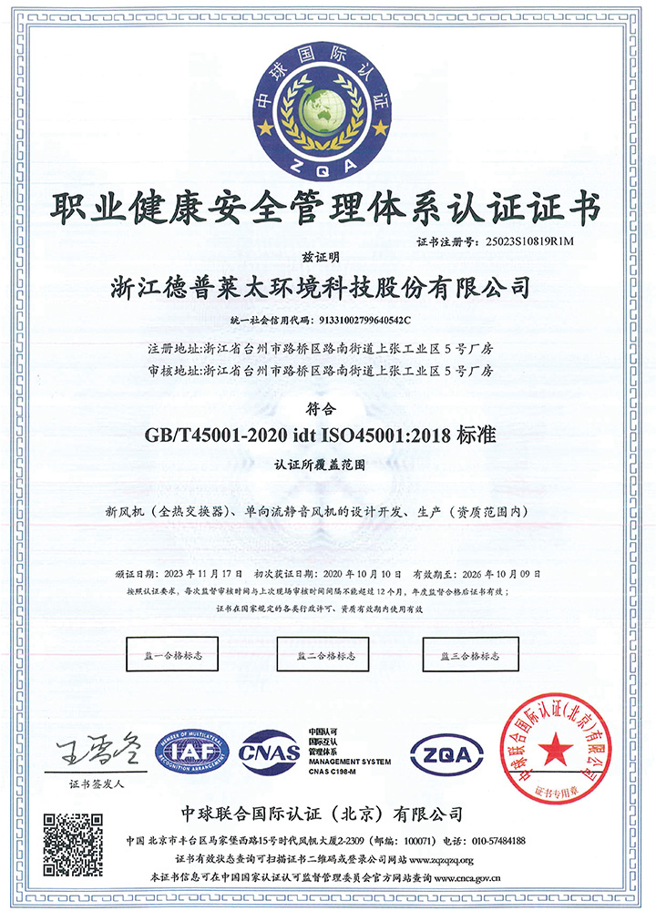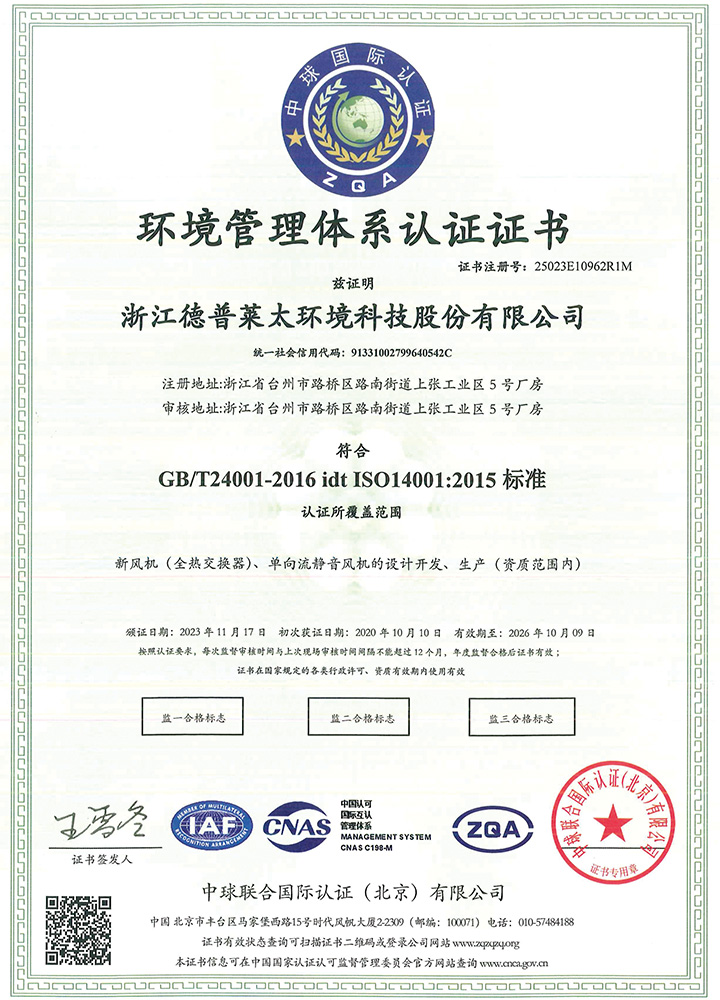公司秉承“誠(chéng)信、擔(dān)當(dāng)、創(chuàng)新、共贏”的企業(yè)精神,產(chǎn)品制造精益求精,通過了ISO9001質(zhì)量管理體系、ISO14001環(huán)境管理體系、ISO45001職業(yè)健康安全管理體系等認(rèn)證。主導(dǎo)起草了T∕NAIC 001-2021《超低能耗建筑新風(fēng)系統(tǒng)技術(shù)規(guī)程》、RISN-TG043-2022《居住建筑新風(fēng)系統(tǒng)應(yīng)用技術(shù)導(dǎo)則》等標(biāo)準(zhǔn),參編了JGJ∕440-2018《住宅新風(fēng)系統(tǒng)技術(shù)標(biāo)準(zhǔn)》、GB∕T 21087-2020《熱回收新風(fēng)機(jī)組》、GB∕T 40438-2021《熱泵型新風(fēng)環(huán)境控制一體機(jī)》、GB∕T 40379-2021《戶用和類似用途組合式空氣處理機(jī)組》等多項(xiàng)標(biāo)準(zhǔn),擁有發(fā)明專利6項(xiàng)。公司是中國(guó)建筑金屬結(jié)構(gòu)協(xié)會(huì)凈化與新風(fēng)委員會(huì)副主任單位、被動(dòng)式低能耗建筑產(chǎn)業(yè)技術(shù)創(chuàng)新戰(zhàn)略聯(lián)盟副理事長(zhǎng)單位,被授予高新技術(shù)企業(yè)、浙江省專精特新中小企業(yè)、浙江省科技型中小企業(yè)、臺(tái)州市專精特新小巨人企業(yè)和國(guó)家級(jí)綠色(設(shè)計(jì))產(chǎn)品、浙江制造精品、浙江制造認(rèn)證證書等多項(xiàng)榮譽(yù)。